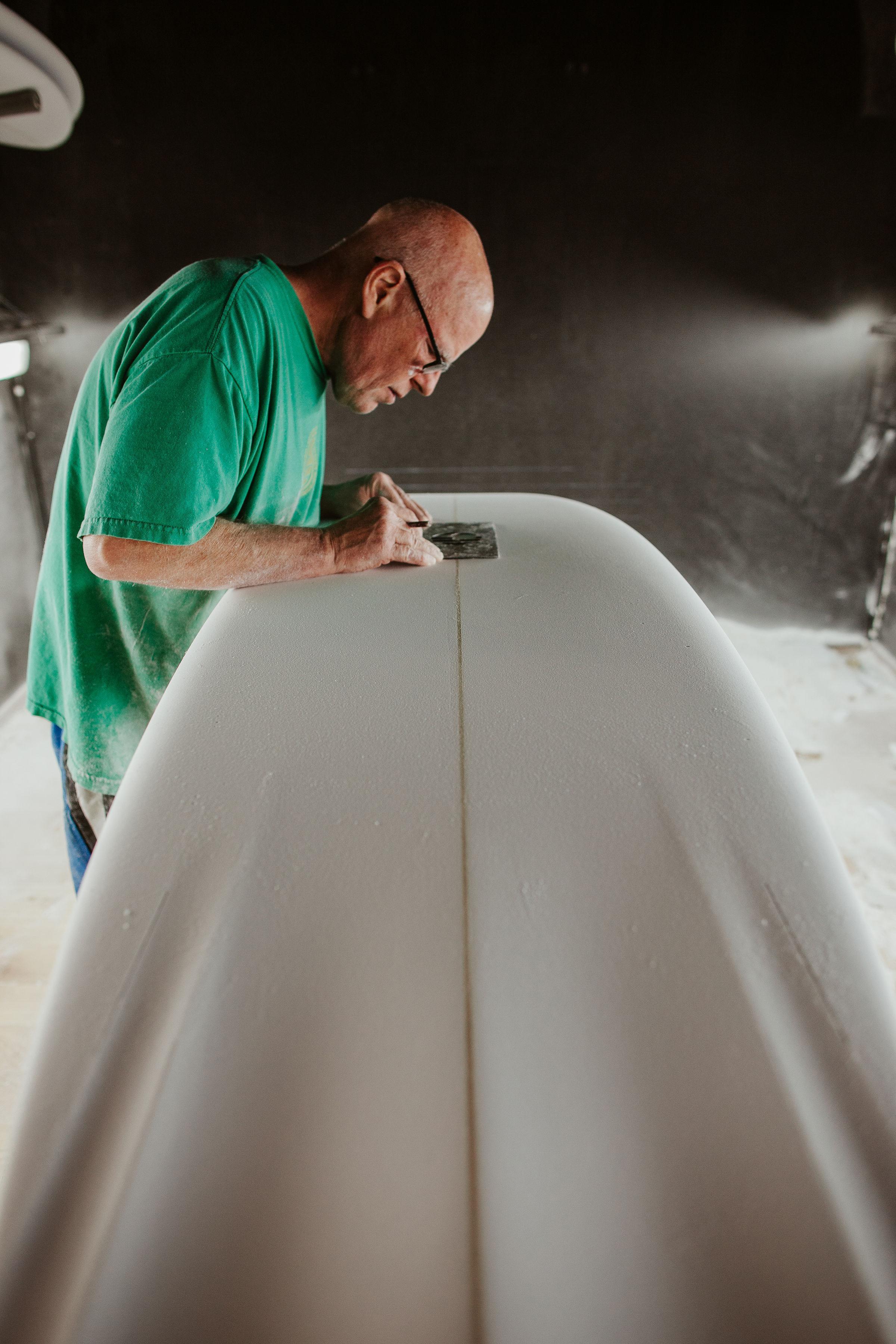 Véritable parrain du shape à San Diego, Bob incarne à lui seul un pan entier de l’histoire du surf américain. Voisin et héritier du savoir de Skip Frye, il perpétue un style inimitable : des lignes fluides, des courbes sans superflu, et une philosophie de glisse fondée sur la simplicité et l’efficacité.