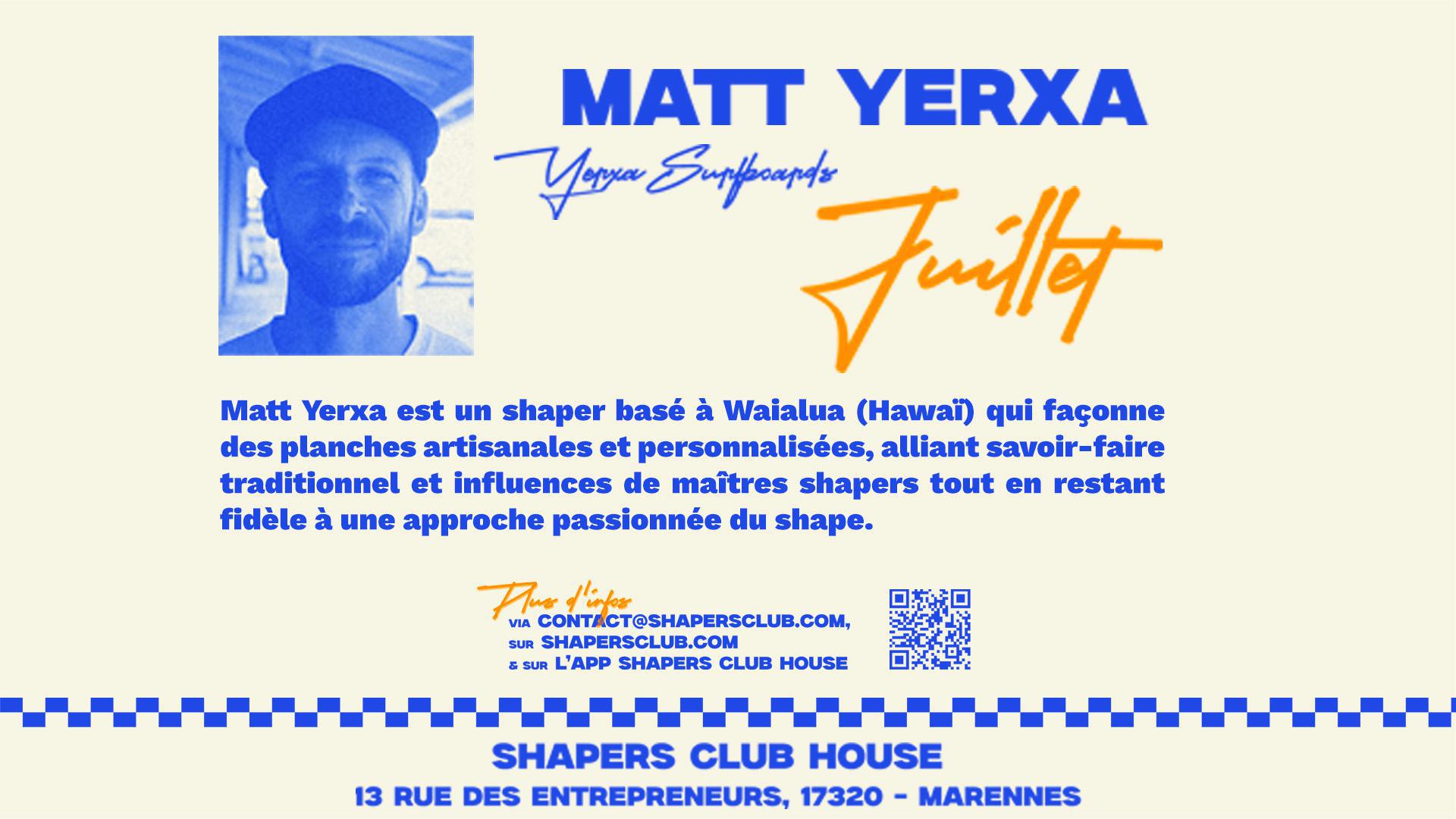Sa venue s’inscrit avant tout dans une session de production à l’atelier : Matt Yerxa viendra shaper plusieurs boards directement sur place, incluant des customs commandés à l’avance ( restez branché, on vous communique bientot le site pour les préco) ainsi qu’une sélection de planches qui seront disponibles en shop après son passage. Fidèle à sa philosophie « Always for love, never for money », il privilégie un travail précis et personnalisé, pensé pour accompagner tous les niveaux de pratique avec des designs hand-shaped issus de son expérience entre Californie et Hawaï.